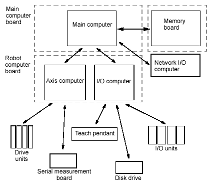 - Robot computer board – contains the I/O computer which acts as a link between the main computer, the world around and the axis computer that regulates the velocity of the robot axes.