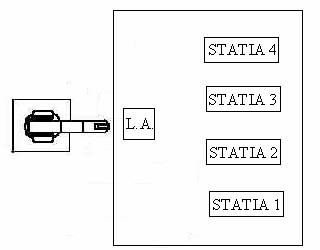 Stations 1 and 2 are extracting parallelepiped pieces, station 3 thick pins, and station 4 thin pins. The piece holders capacity corresponding to stations 1, 2 and 3 is of eight elements, the fourth having a double capacity. L.A. represent the place where the robot can execute the assembling operations.