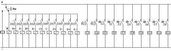 A+, A- are the electro-valve command coils for station 1 piston air distribution. Identically, B+, B- are associated to station 2 piston, C+, C- to station 3 piston and D+, D- to station 4 piston. E+ and E- have a role in gripper closing and opening.